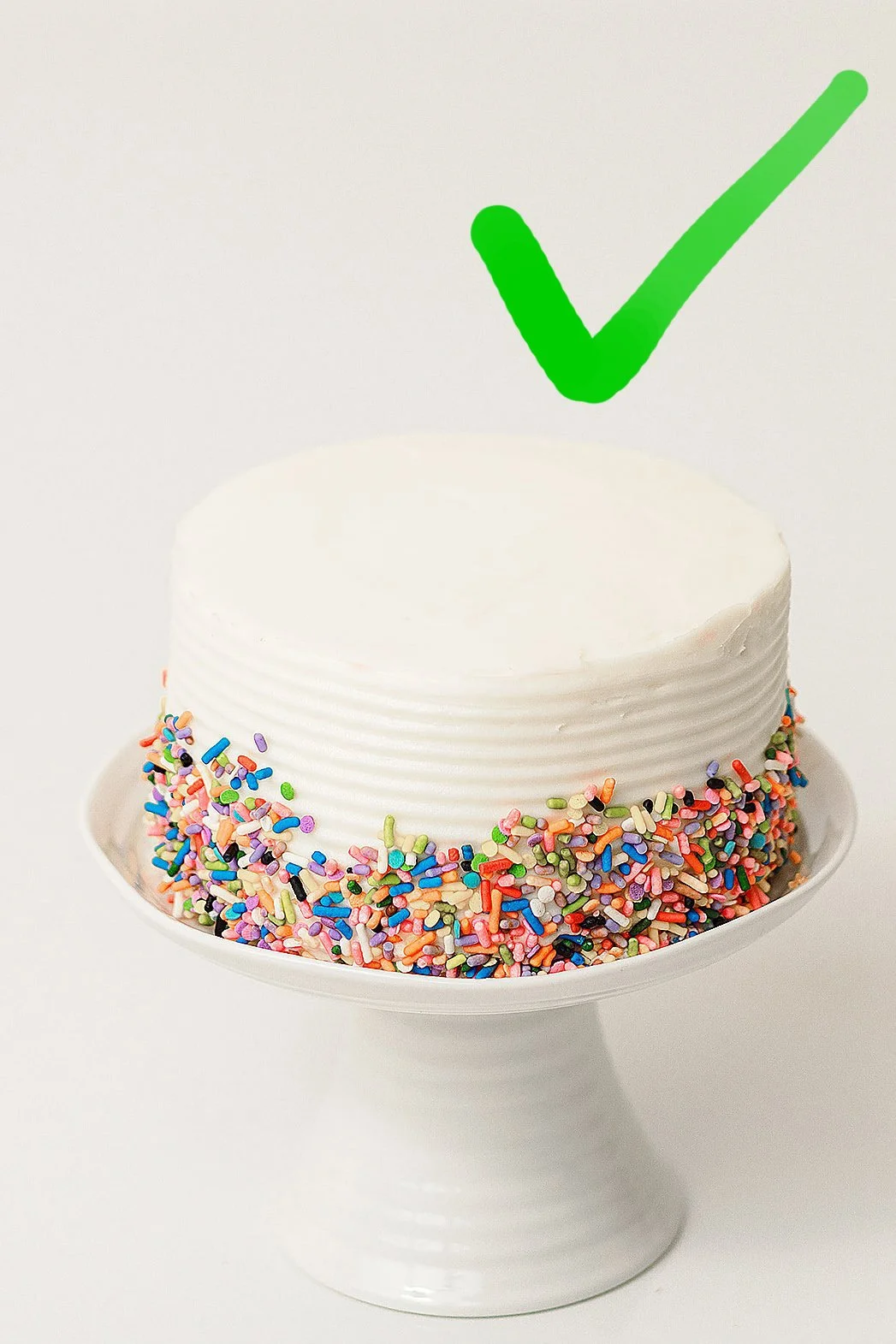 show them the photo green check mark below and ask for above specifications (cake: 5 inches, white icing, 3 small tiers, no piping icing on bottom, sprinkles instead).